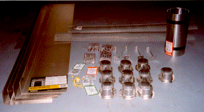 Across the back are the expanded aluminum grill 'gutter covers'. A roll of sheet aluminum, several downspouts, and a few boxes of sheet metal screws complete the list. Not pictured is a roll of aluminum duct tape, 4 hose clamps, a few nylon ties, and some paint. |